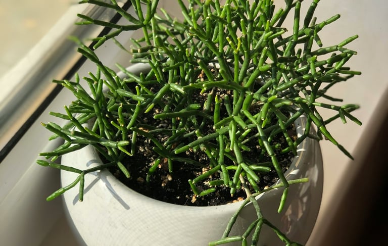 O cacto-macarrão (Rhipsalis) é a planta dos sonhos para quem quer um visual moderno e minimalista. Suas hastes pendentes criam um efeito único!